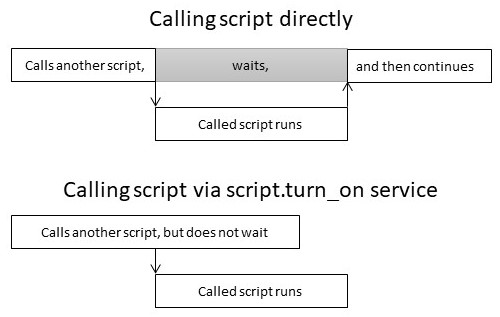 Following is an example of the calling script not waiting. It performs some other operations while the called script runs “in the background.” Then it later waits for the called script to complete via a wait_template.