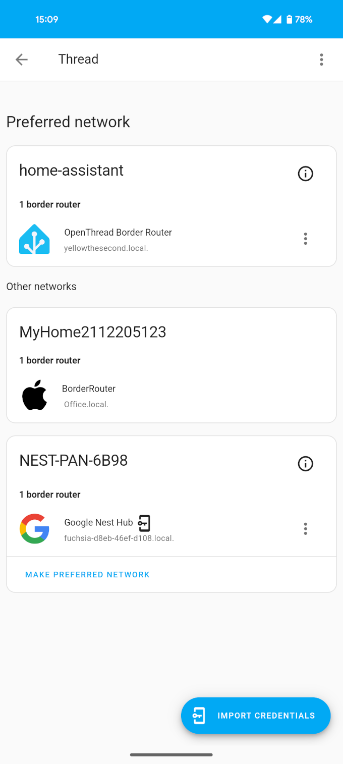 - Importing the credentials allows a Google- or Apple-created Thread network to be the preferred network of Home Assistant.