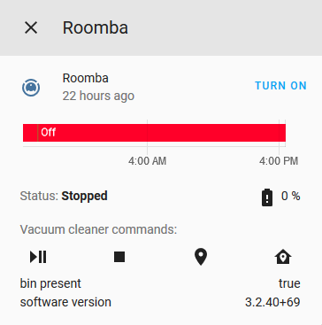 The Roomba integrationsIntegrations connect and integrate Home Assistant with your devices, services, and more. [Learn more] allows you to control your iRobot Roomba