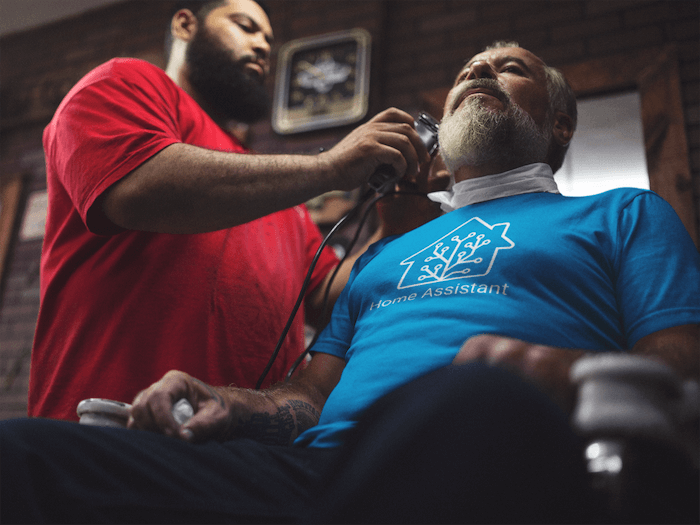 Cool dude with beard and tattoo wearing [the new blue Home Assistant shirt][blue-us].