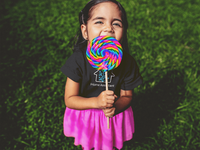 Cute girl with gigantic lollipop rocking the new black Home Assistant shirt.