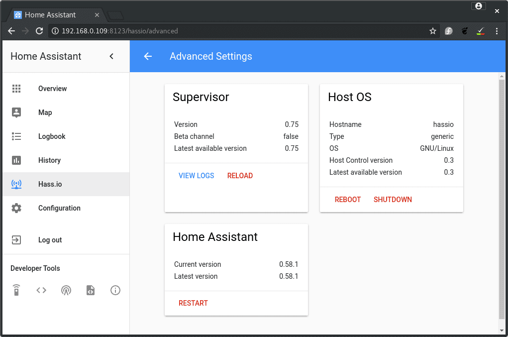 Hass.io is now ready. The frontend is available at http://192.168.0.109:8123