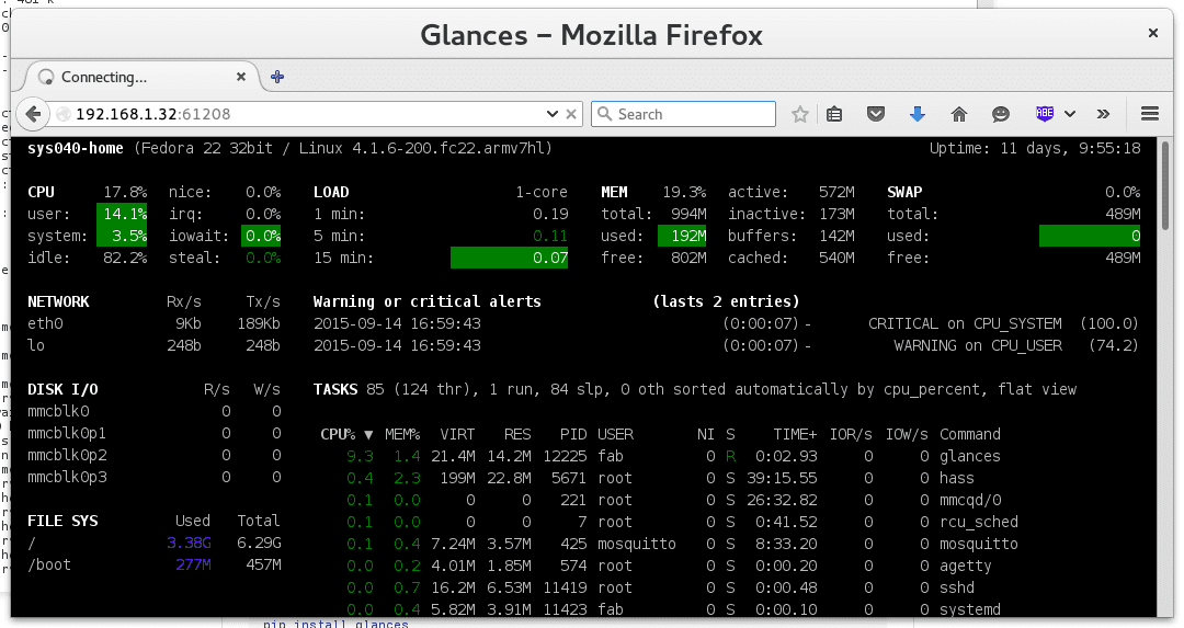 In this post a default Fedora 22 Workstation installation is used on the host that should be monitored. In fact, it doesn’t matter if the system is the local one or a remote one as long as Glances is available. With some adjustments it should work on your own systems too. The difference will be the package and the firewall management tools.