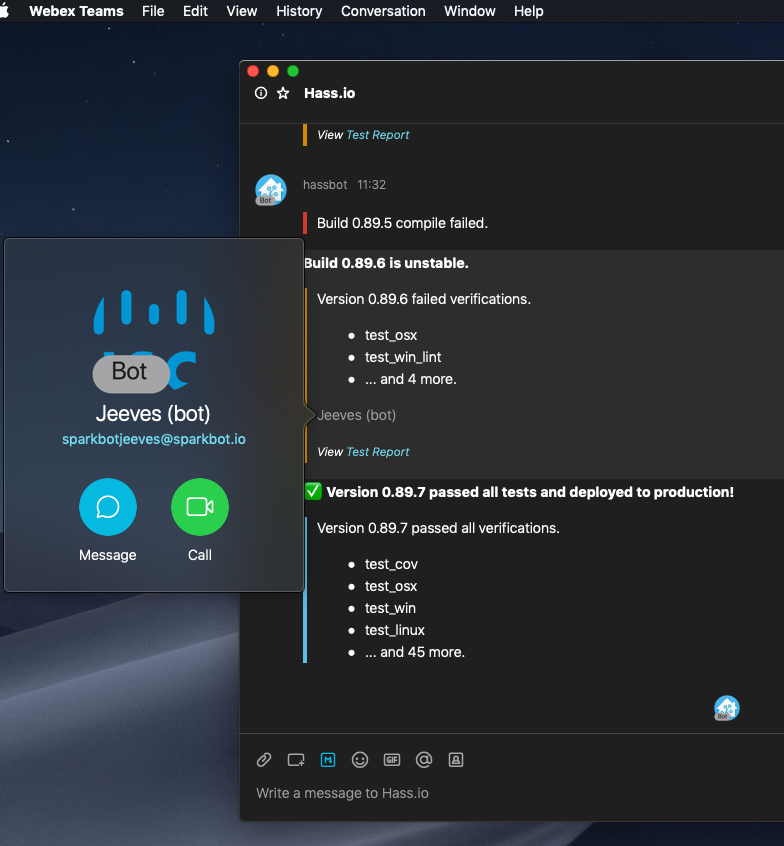 The cisco_webex_teams notification platform allows you to deliver rich notifications from Home Assistant to Cisco Webex