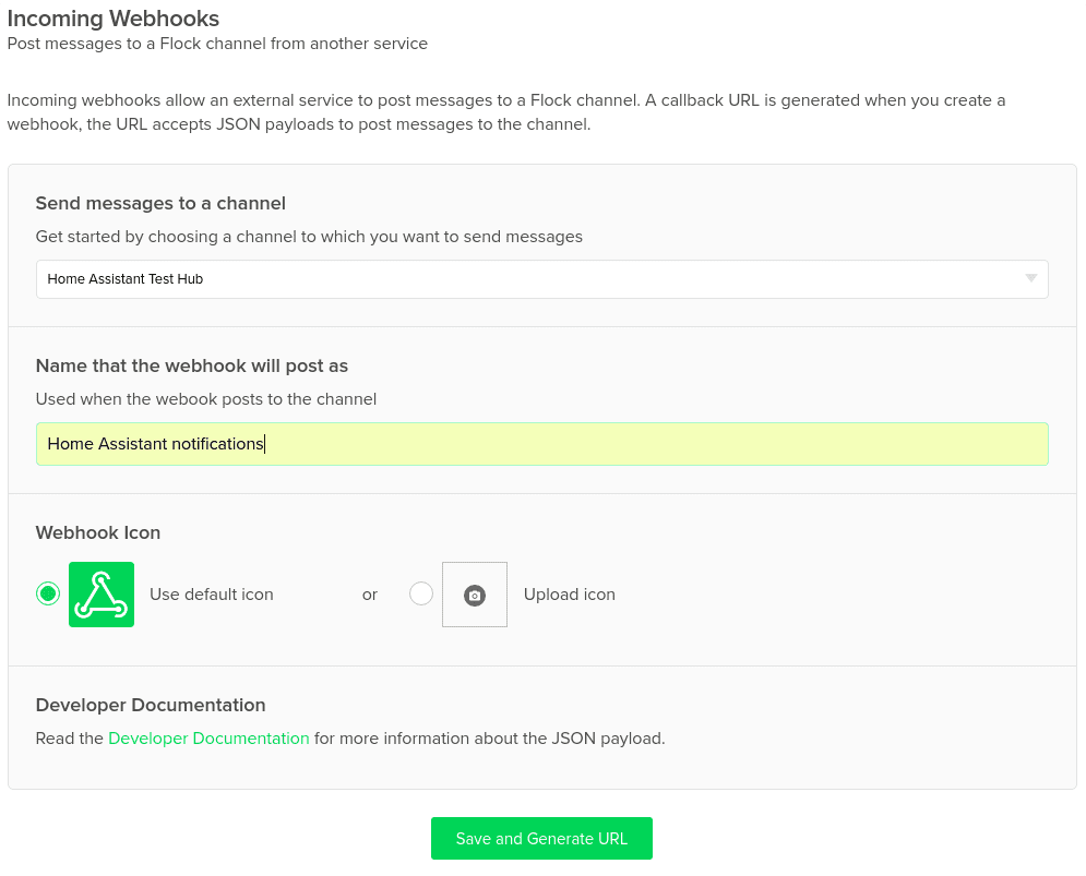 To add Flock notifications to your installation, add the following to your configuration.yamlThe configuration.yaml file is the main configuration file for Home Assistant. It lists the integrations to be loaded and their specific configurations. In some cases, the configuration needs to be edited manually directly in the configuration.yaml file. Most integrations can be configured in the UI. [Learn more] file.